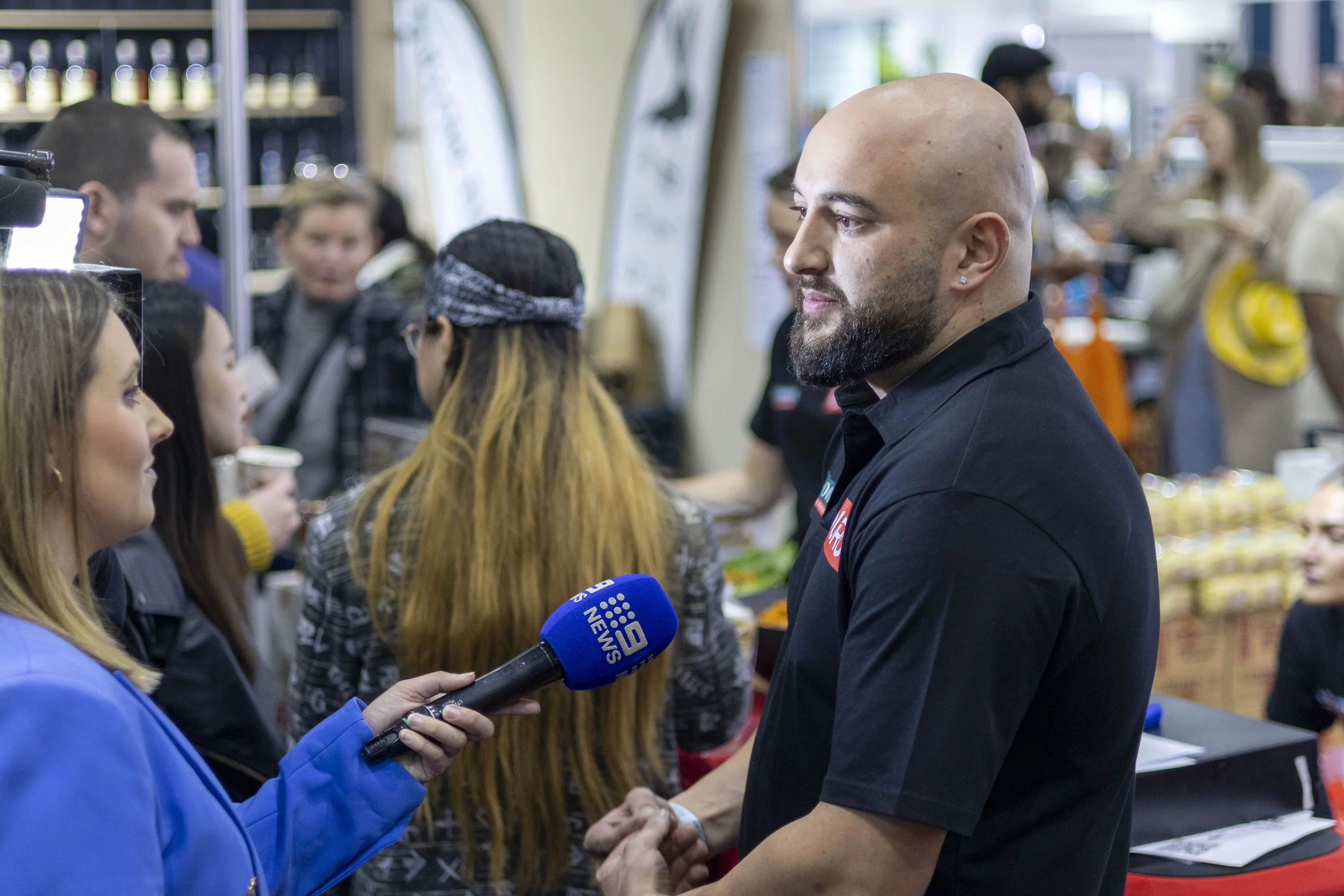 A man with a shaved head and beard is being interviewed by a female reporter holding a blue microphone. The interview takes place in a busy indoor setting with other people in the background, some shopping or viewing displays.