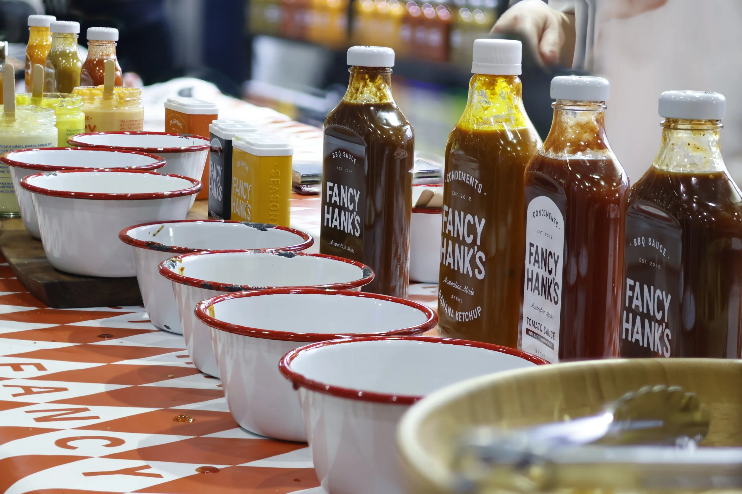 Assorted bottles of barbecue sauce behind white bowls with red rims on a table.