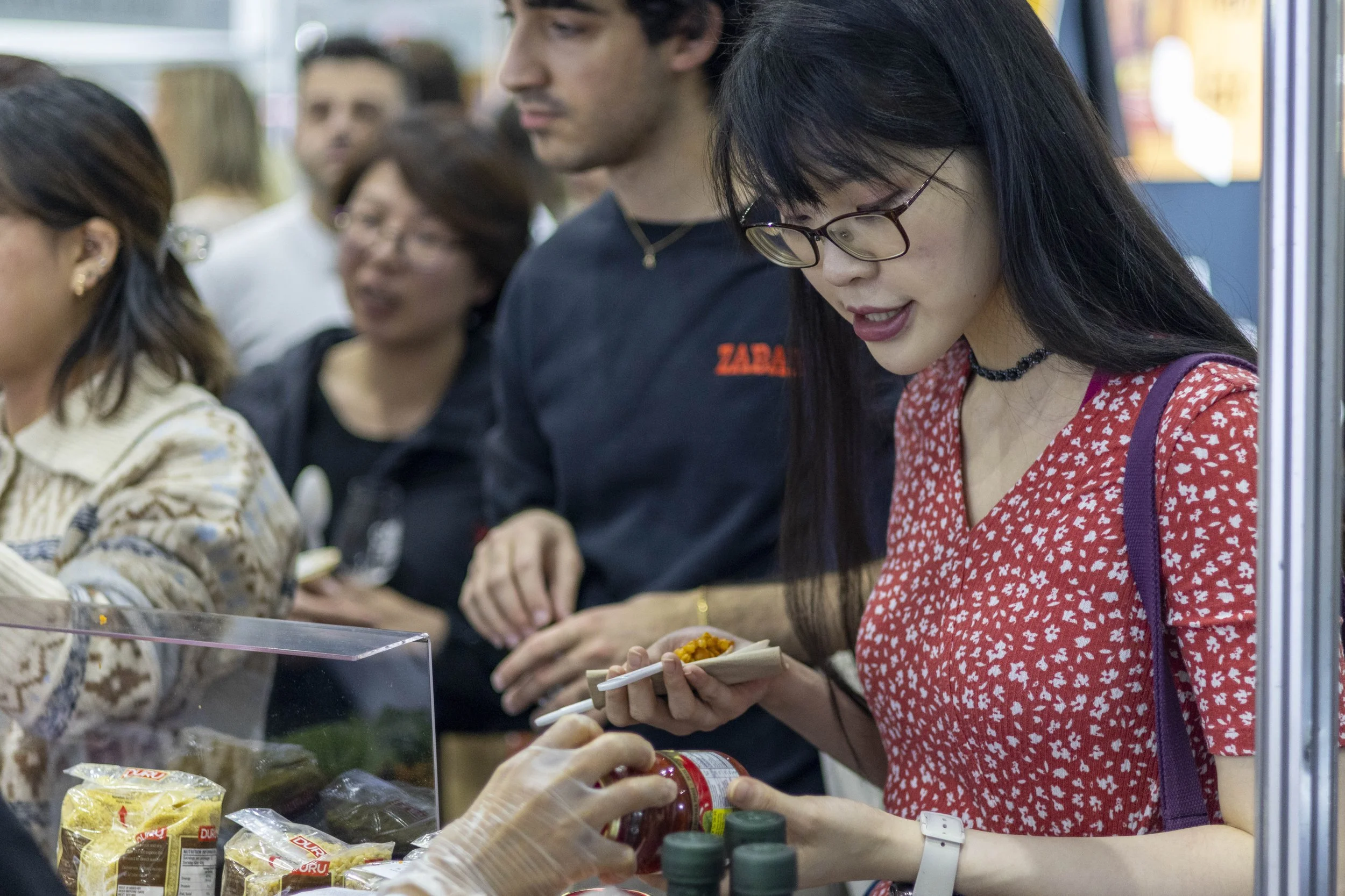 A young woman with long black hair, glasses, and a red patterned shirt, is holding a bottle of sauce and a small plate of food while ordering at a food stall. Several people are in line behind her, and the scene appears to be in a busy indoor food ma