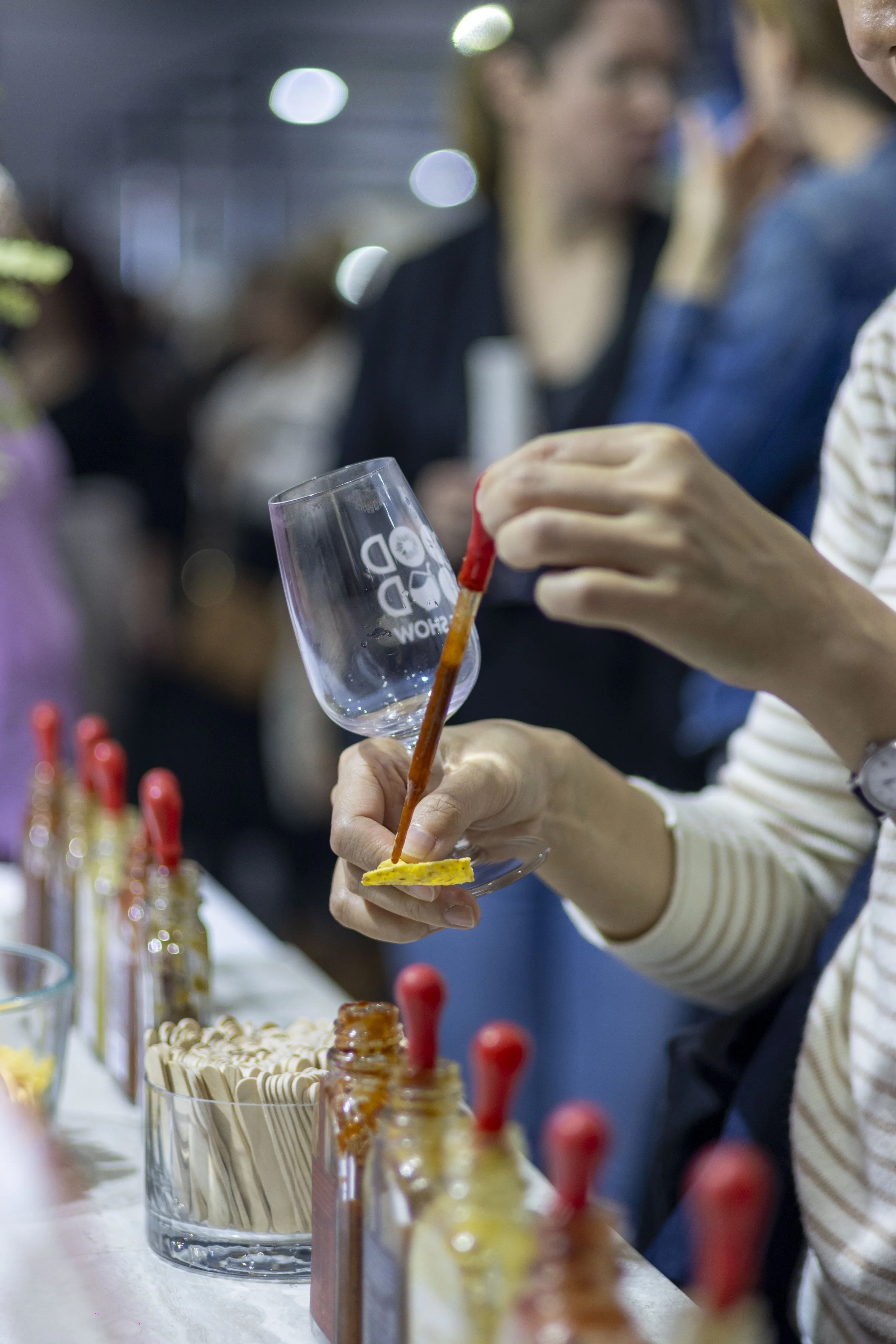 Person decorating a champagne glass with a small yellow sponge and a paintbrush at a food event.