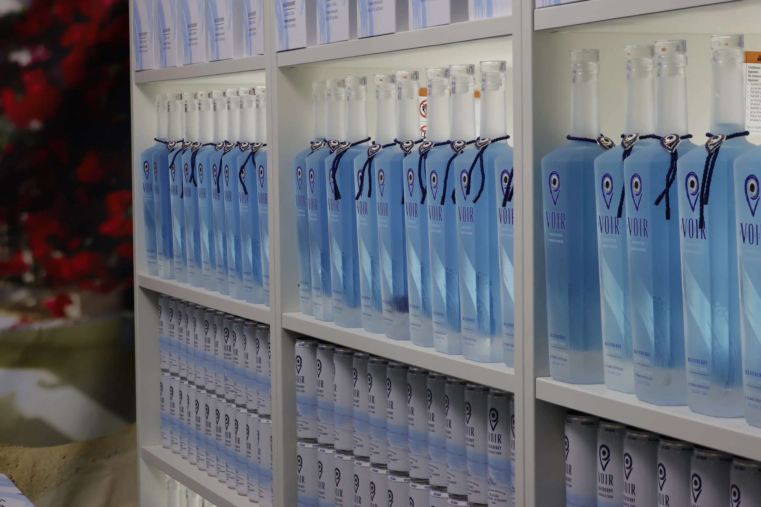 Shelves filled with bottles of blueberry flavored beverages with labels reading 'VOIR.' The bottles are arranged in multiple rows on white shelves.