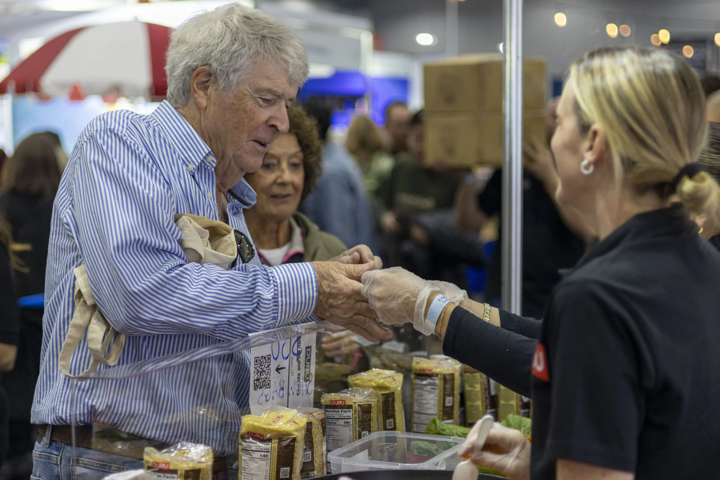 An elderly man receives food from a woman at a market or food event, with people and stalls in the background.