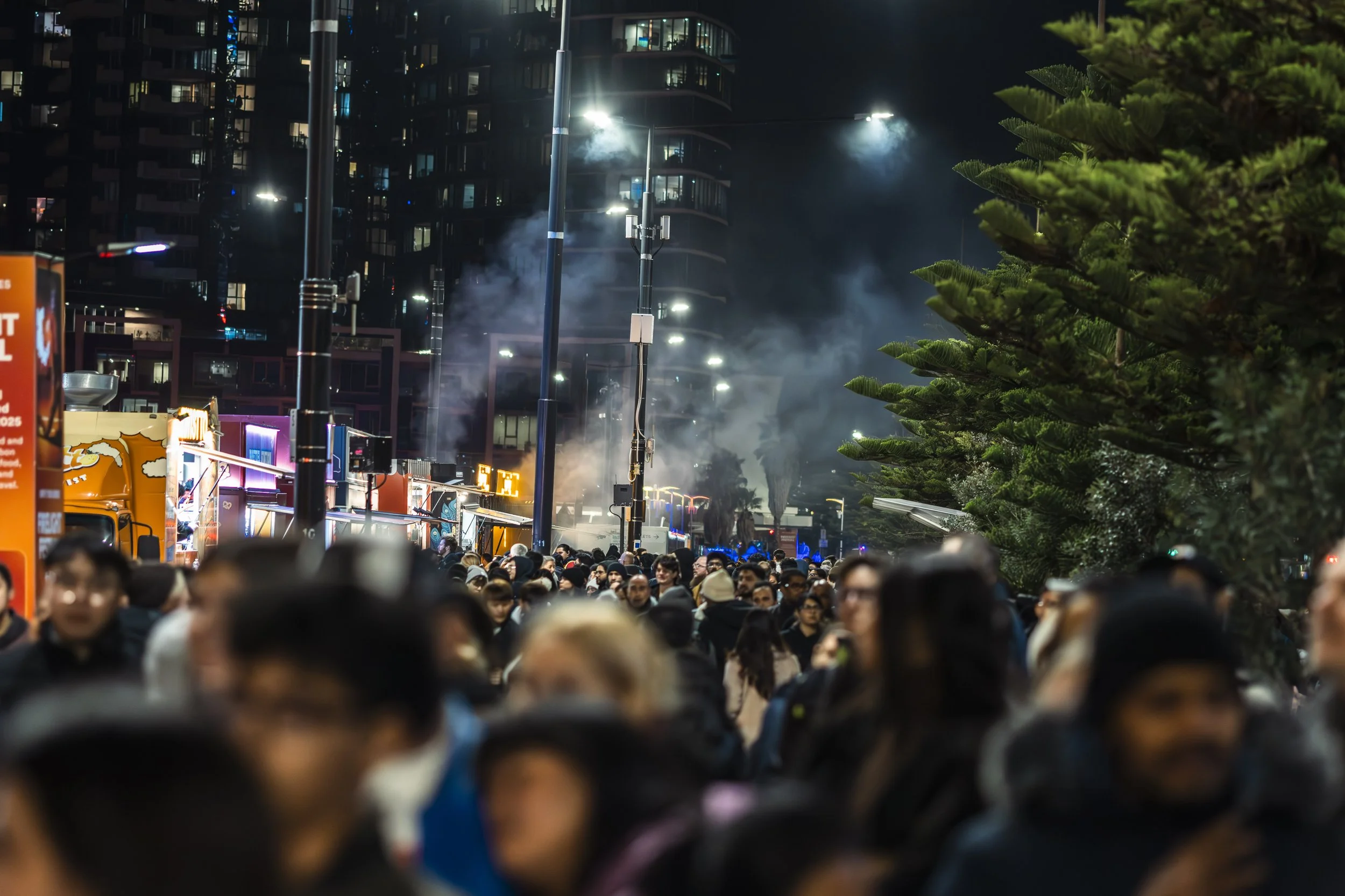 Crowd of people gathered at an outdoor event at night with food trucks and illuminated buildings in the background. There is smoke in the air and some trees on the right side.