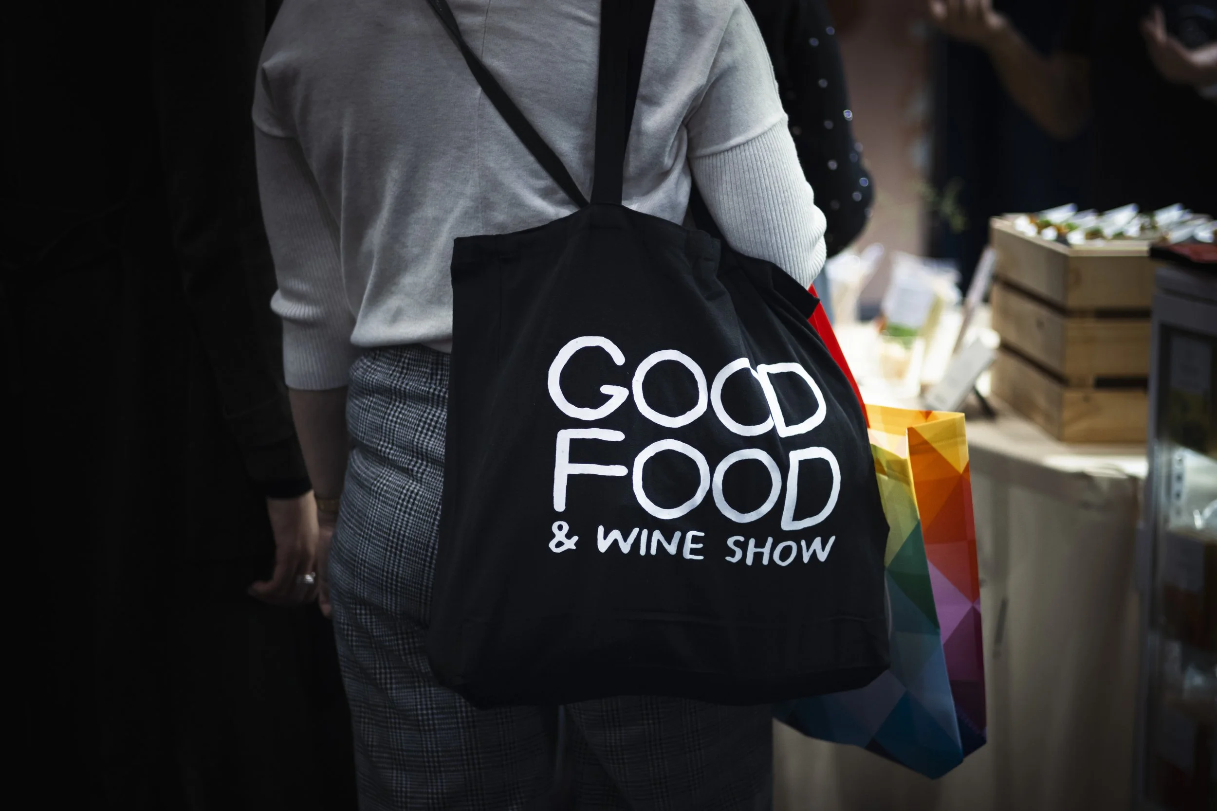 Person at a trade show carrying a black bag with white text that reads 'GODD FOOD & WINE SHOW'