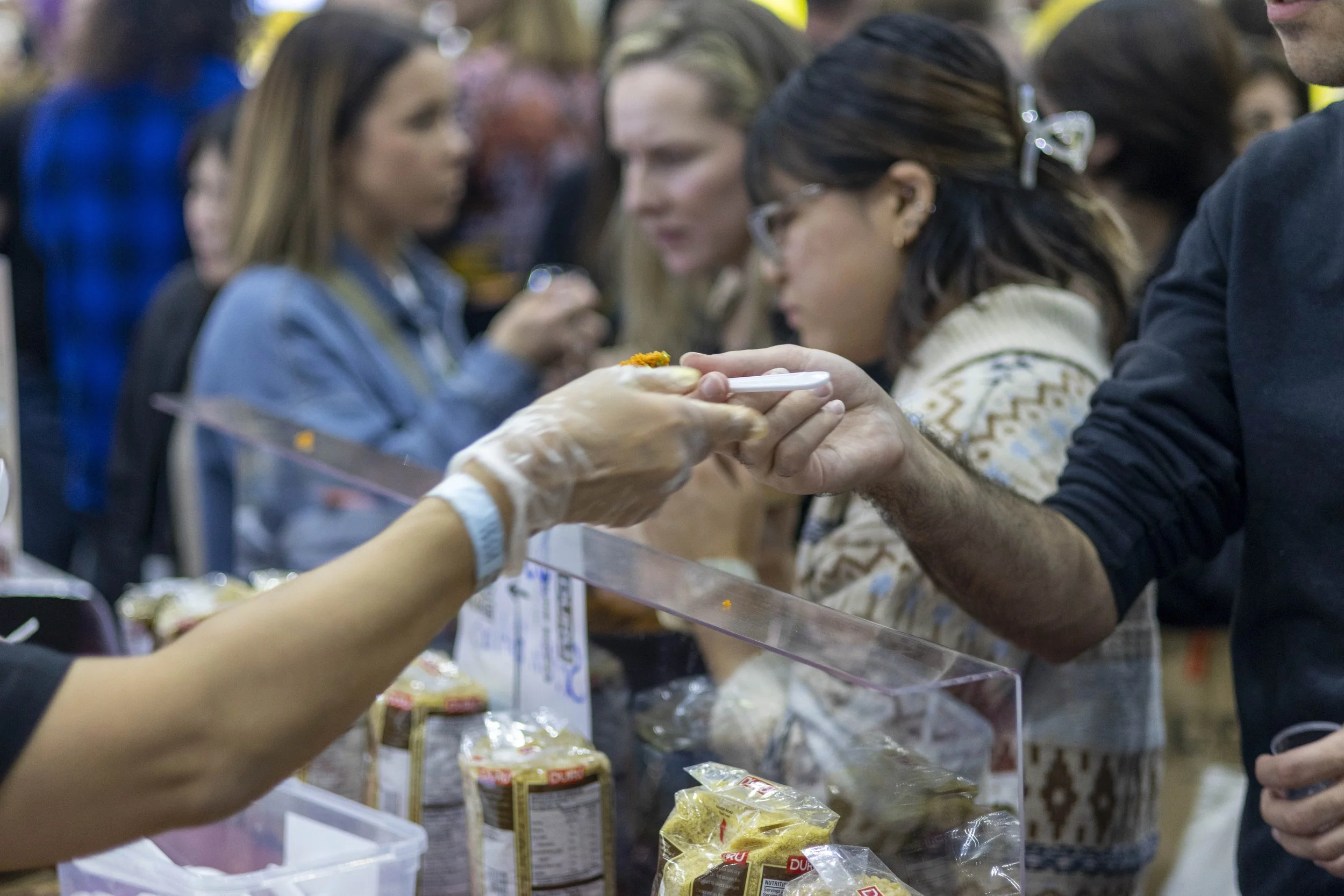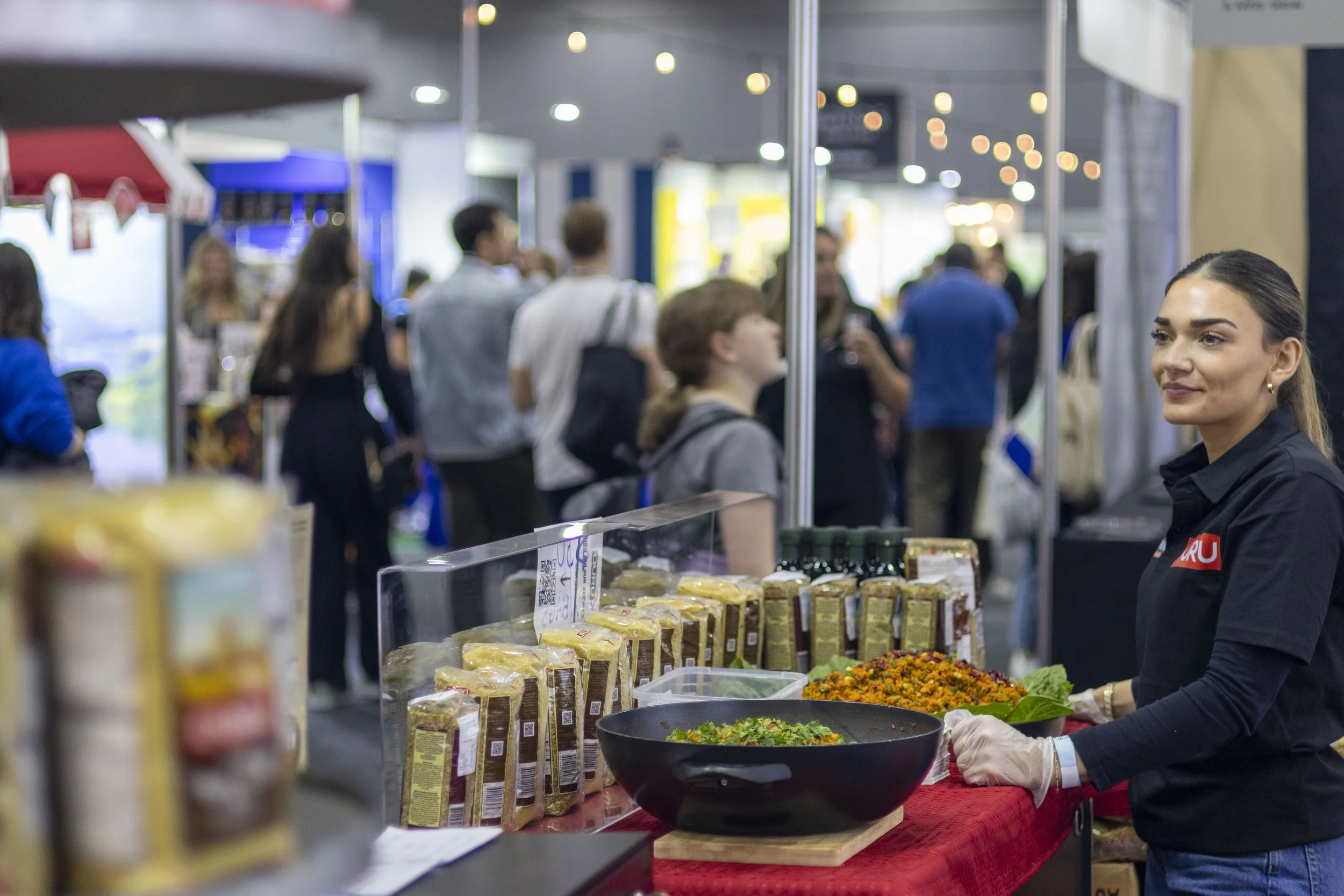 A woman wearing a black shirt with red and white logo, plastic gloves, stands behind a table at a food stall with salads and packaged spices, at a busy indoor market or exhibition.