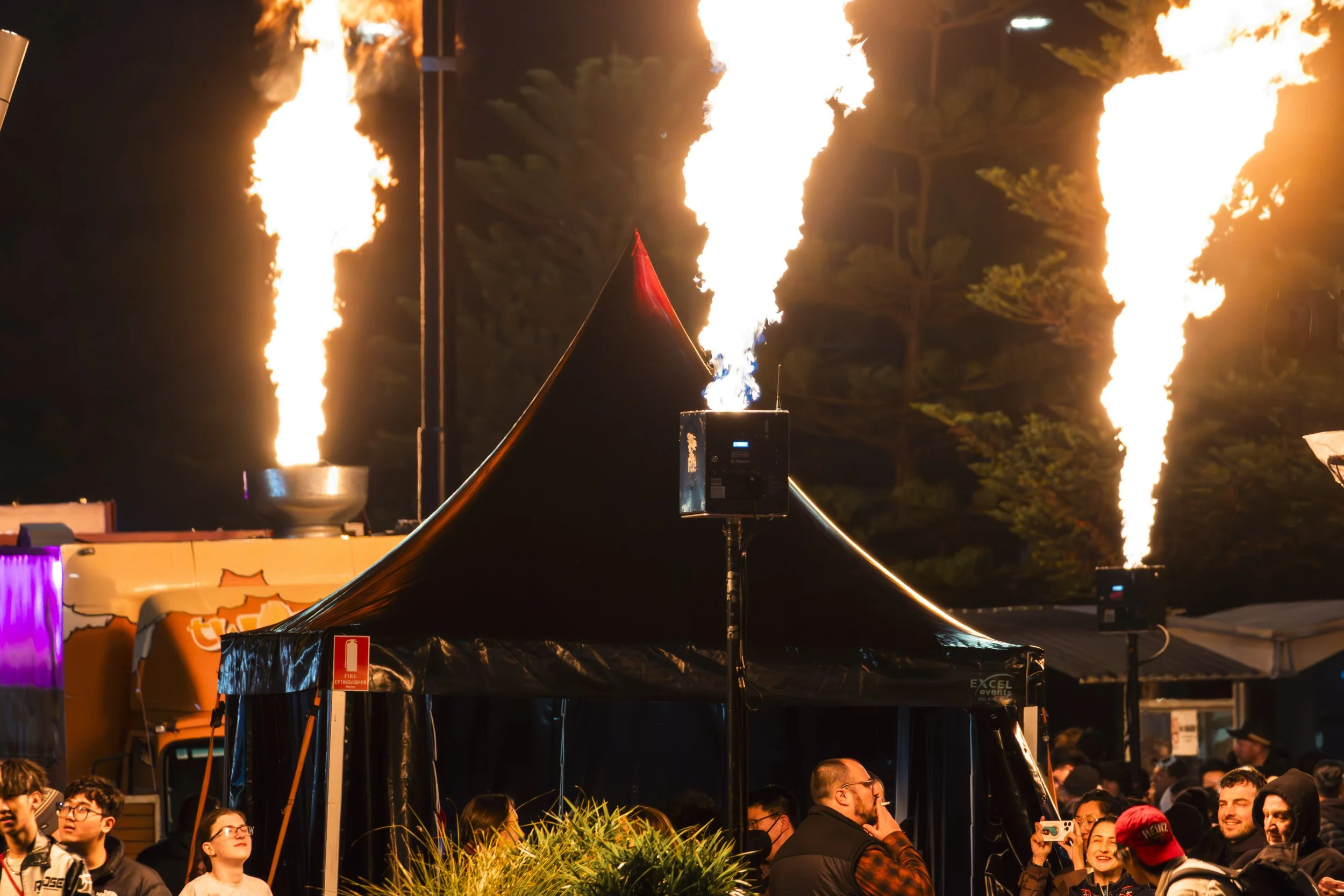 Night scene at a festival with a black tent and four large fire torches emitting flames in the background, and people gathered around enjoying the event.