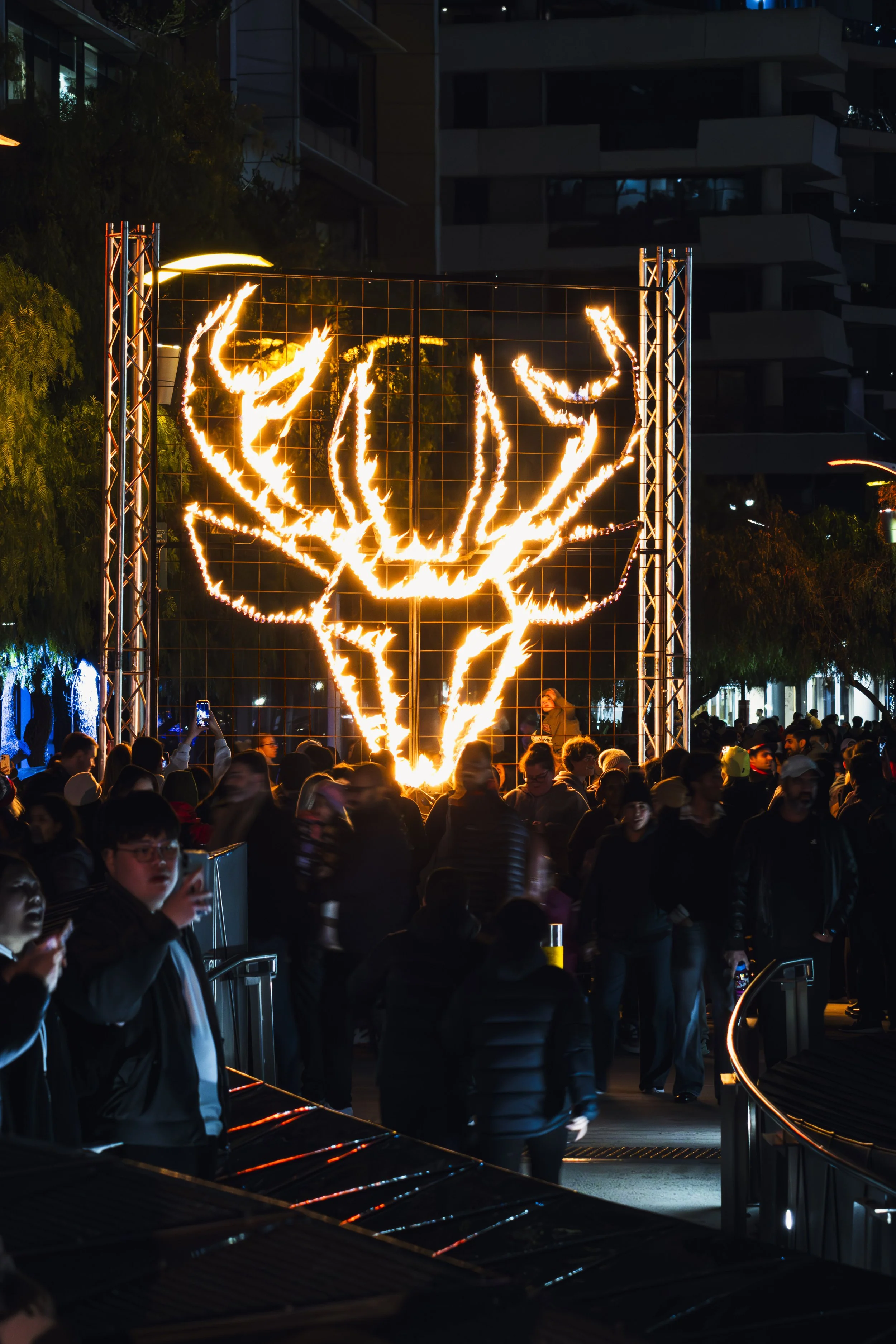 A crowd of people at night gathered in front of a large fiery outline of a deer's head, which is on a metal frame.
