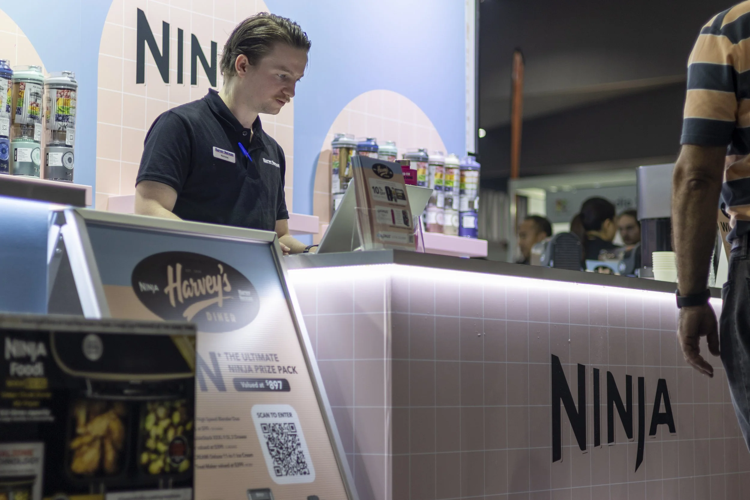 A man at a counter in a Ninja-themed food stand called Harvey's NINJA, with a promotional sign and merchandise in the background, interacting with a customer in a striped shirt.